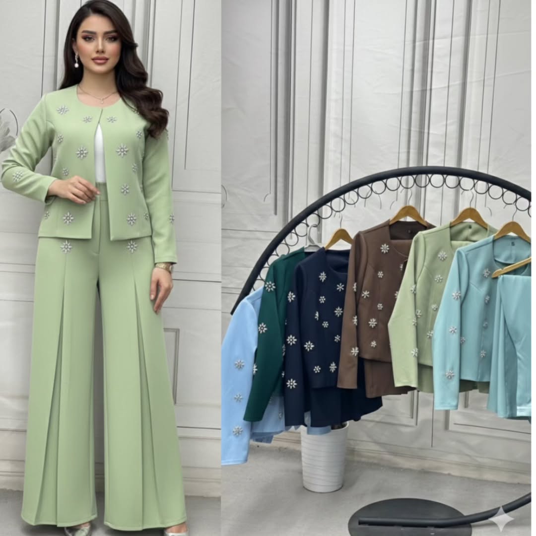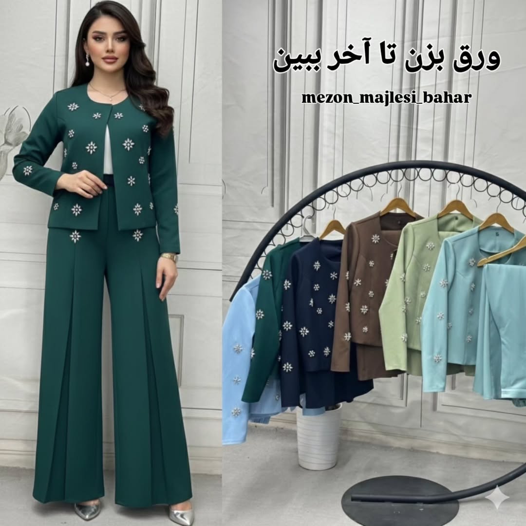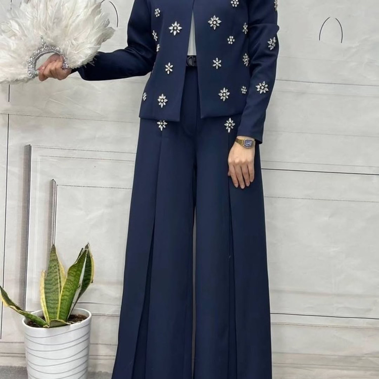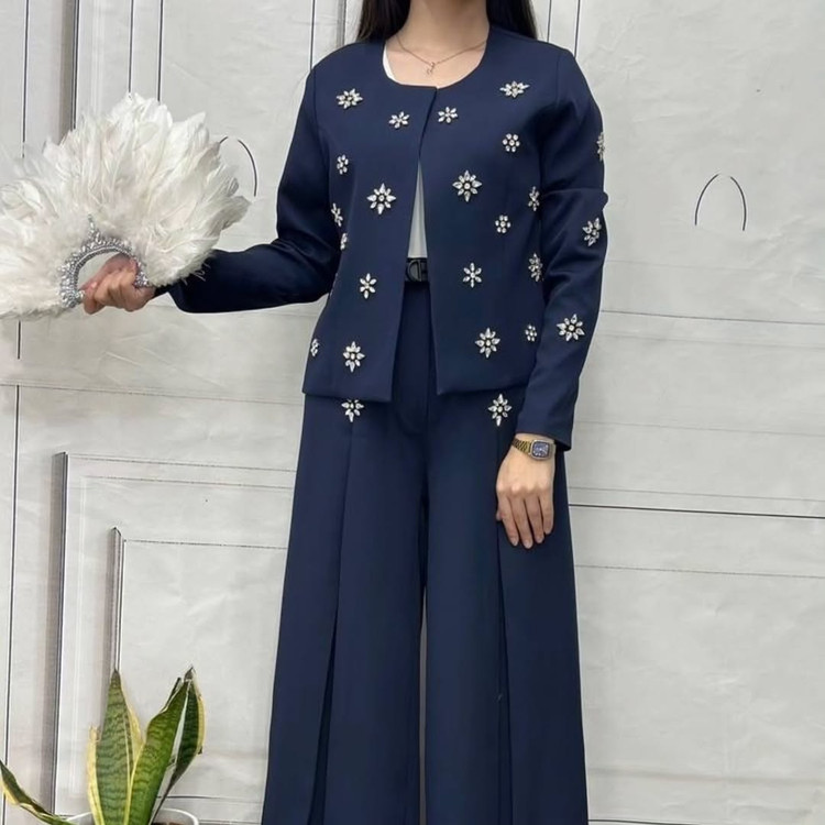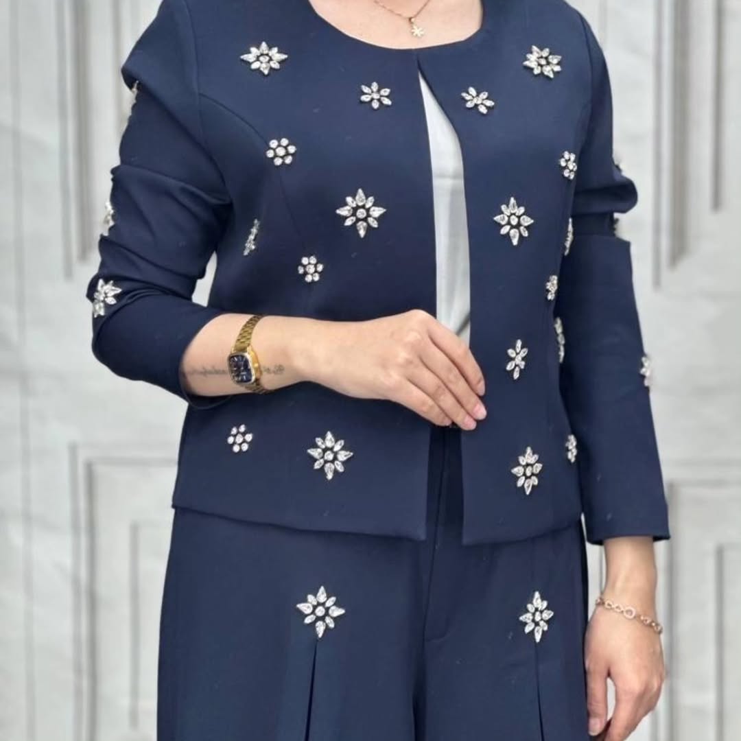 این کت و شلوار مجلسی با سنگدوزی ظریف و حرفهای، انتخابی شیک و خاص برای خانمهایی است که به استایل رسمی و لاکچری اهمیت میدهند. طراحی سنگدوزیها کاملاً اصولی انجام شده و بدون ایجاد سنگینی، جلوهای درخشان و مجلسی به لباس بخشیده است.