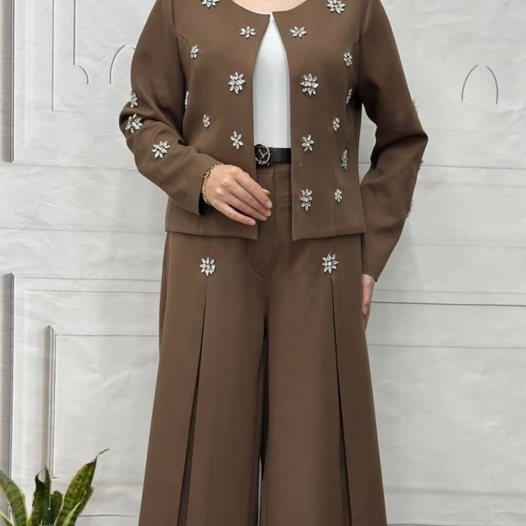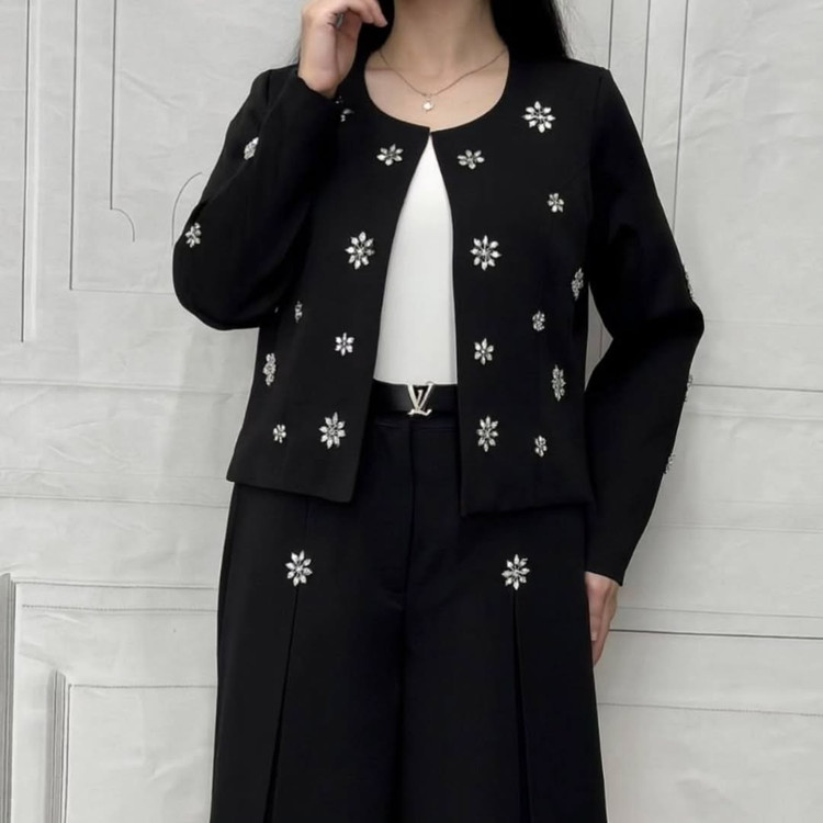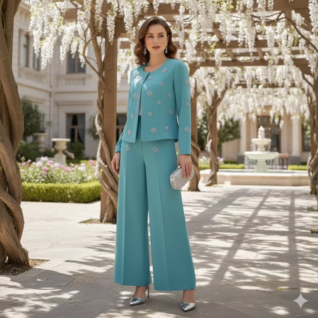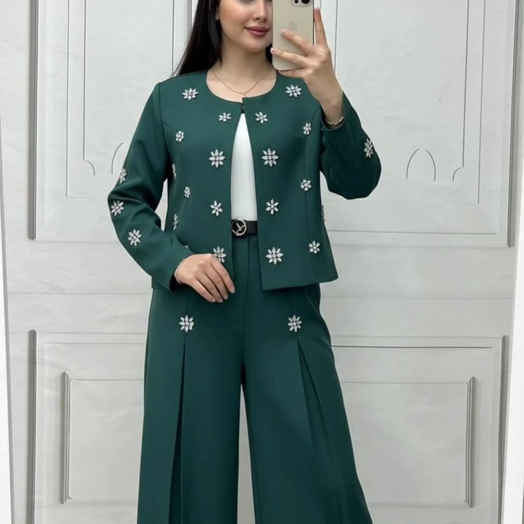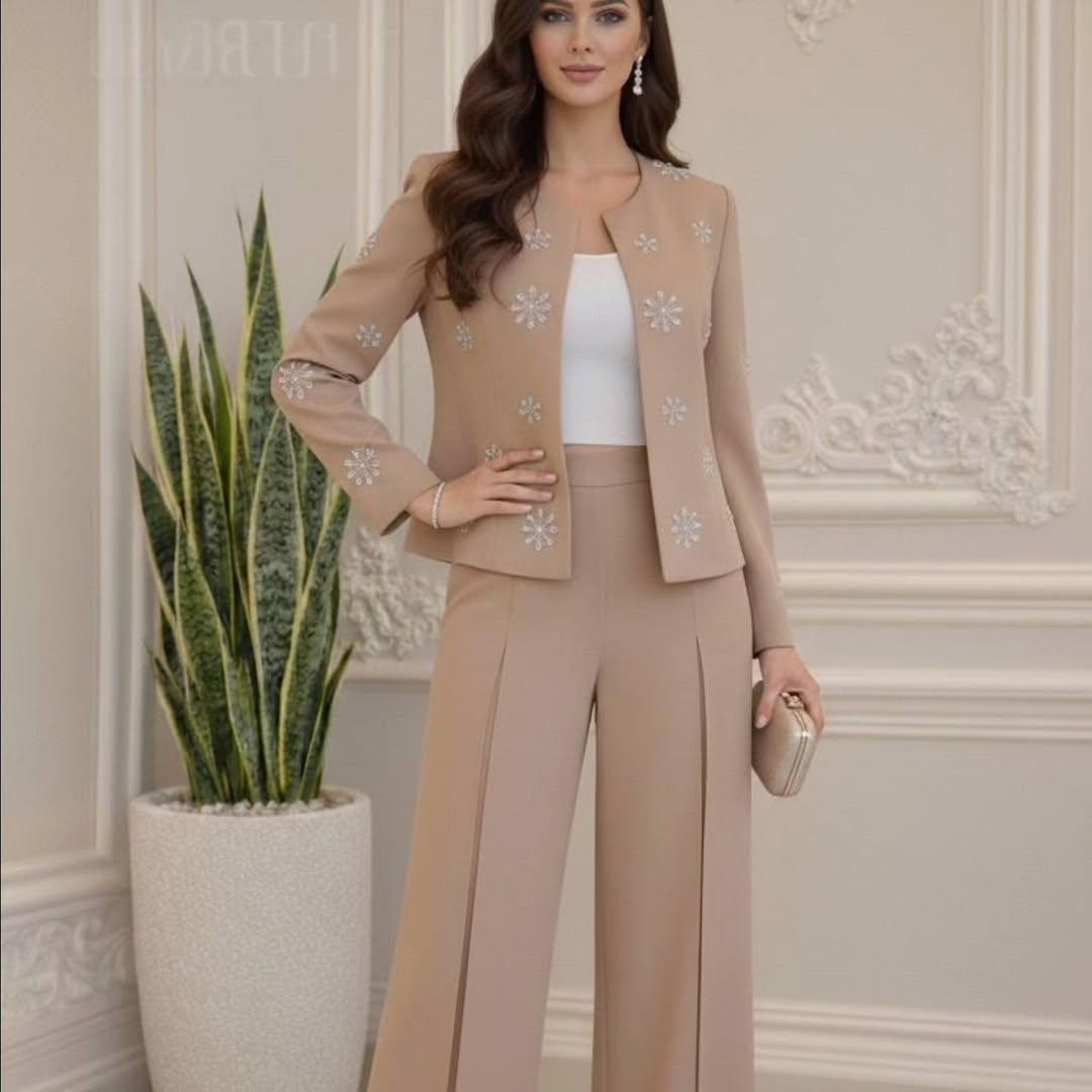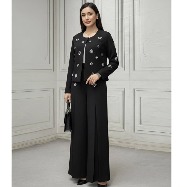 این کت و شلوار مجلسی با سنگدوزی ظریف و حرفهای، انتخابی شیک و خاص برای خانمهایی است که به استایل رسمی و لاکچری اهمیت میدهند. طراحی سنگدوزیها کاملاً اصولی انجام شده و بدون ایجاد سنگینی، جلوهای درخشان و مجلسی به لباس بخشیده است.